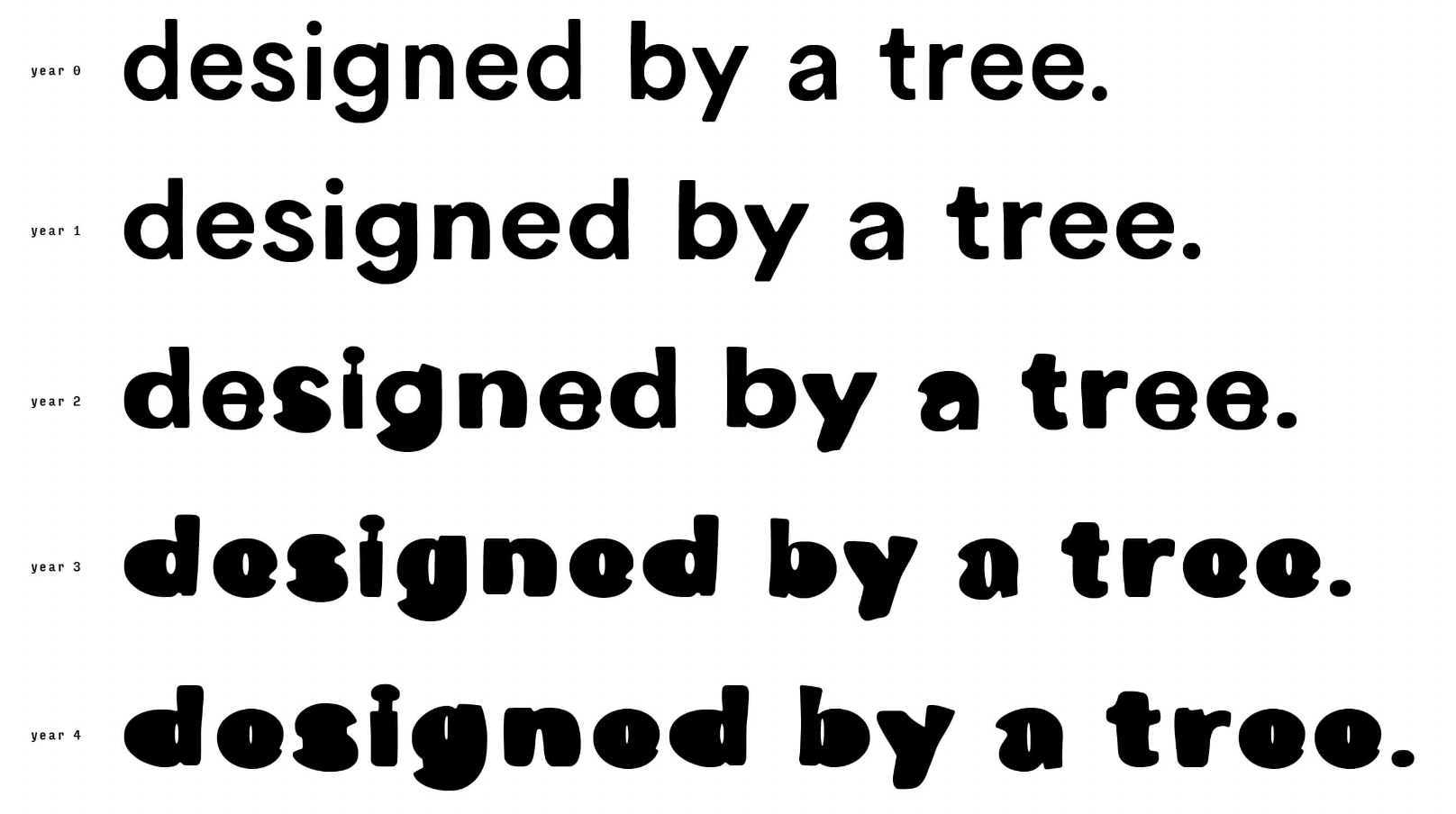 - 树皮字体:设计师通过在数皮上刻了26个英文字母,定期观察记录它们发生的变化。随着树木年龄的增加,字体的横向距离由于树干的变粗而增加,反而是高度并没有太大差异。设计师以此为灵感设计了一款和时间产生化学反应的字体,随着字体使用年限的不同,它们也会呈现出不同的样式。这里应该还有一个变量,就是树的种类,就和不同材质的毛笔书写出来的字也有差异一样。所以再往下一步,指不定会细分成杨树字体,梧桐树字体,柏树字体。我想到它们的一个使用场景,比如放到白酒的外包装上,十年陈酿和二十年陈酿一眼就区分出来了。