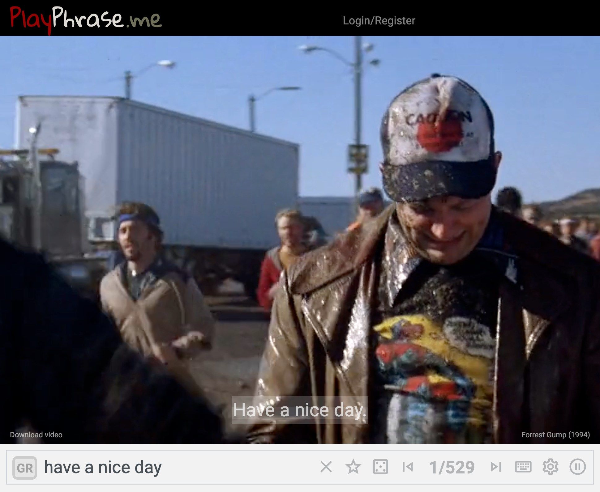 - 电影台词搜索:这个网站可以根据所输入的单词或者语句,去搜索那些包含有该段台词的电影片段,并且可以下载该片段。既可以学到英语发音,又能看到喜欢的英文电影,一举两得。免费用户只能看5个视频,观看更多需要赞助25港币/月。电影库看起来很广,比如我搜索了个常用短语「have a nice day」,有529个结果。其中top5是《阿甘正传》《妈的多重宇宙》《无间行者》《寻找苏菲娅》《发条橙》。