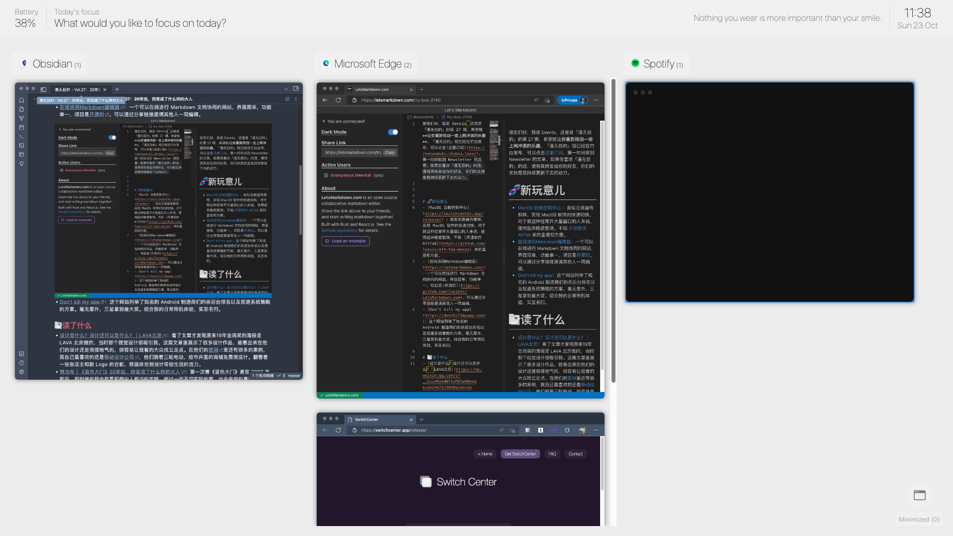 - MacOS 白板控制中心 :类似无限画布那样,实现 MacOS 软件的快速切换。对于我这种经常开大量窗口的人来说,使用起来略感繁琐。不如开源软件 AltTab 来的直观和方便。
